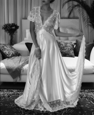 Sa longue robe de nuit blanche, broderie de chair, sceint amoureusement ses hanches et lui donne un grand air. Comtesse parée de dentelle posée sur sa poitrine son corps entier brille éclatante vitrine ! Sa peau sous le satin exp ...