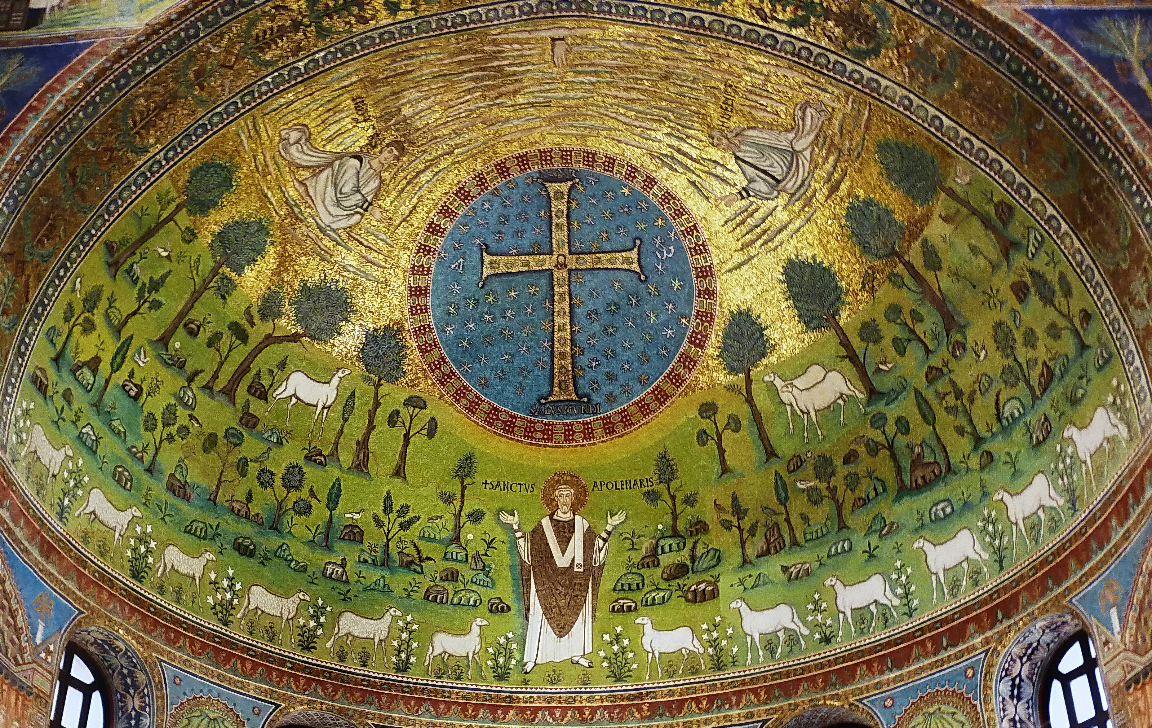 Au-dessus du grand médaillon de l'abside, la main de Dieu émerge d'un ciel rempli de nuages. Les prophètes Ãlie et Moïse qui apparaissent sur les côtés de la croix, font partie du récit de la Transfiguration dans l'Ãvangile selon Matthieu. Sous le médaillon, trois agneaux dans une prairie verdoyante, le museau levé vers la croix, symbolisent les apôtres Pierre et les deux frères Jacques le Majeur et Jean, qui se trouvaient aux côtés de Jésus lors de la Transfiguration. Dans la partie inférieure, au milieu d'un pré fleuri, saint Apollinaire, est représenté dans l'attitude de l'orant, les bras levés et les mains ouvertes, dans une prière d'intercession vers le ciel. L'évêque, vêtu de l'habit sacerdotal et portant le pallium épiscopal, est entouré de douze agneaux, figurant les fidèles qui suivent leur berger.