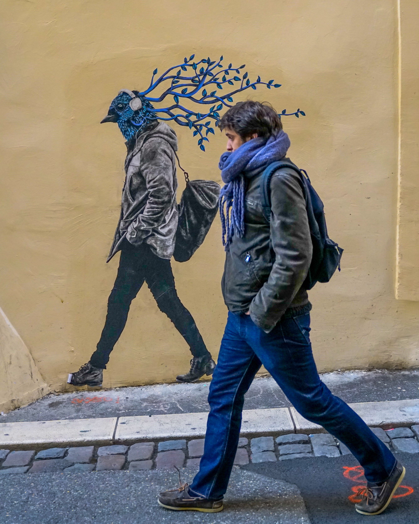 la photo de Patrick Chenal est particulièrement représentative de la photo de rue, ou street photo, elle raconte une histoire. C’est une photo couleur prise en mode portrait. On identifie rapidement un jeune homme qui marche dans la rue, habillé de façon moderne, avec une écharpe assez grosse et d’un sac à dos. La rue n’a l’air ni très large, ni très passante puisqu’il marche au milieu, et elle descend légèrement. On voit en arrière-plan un mur couleur jaune pâle sur lequel il y a un dessin, ou plus exactement, un collage. C’est le dessin d’un homme à tête d’oiseau, muni d’écouteurs, des rameaux sortent de sa tête. Au niveau symbole, l’oiseau représente souvent la vie, et les ramures les objectifs